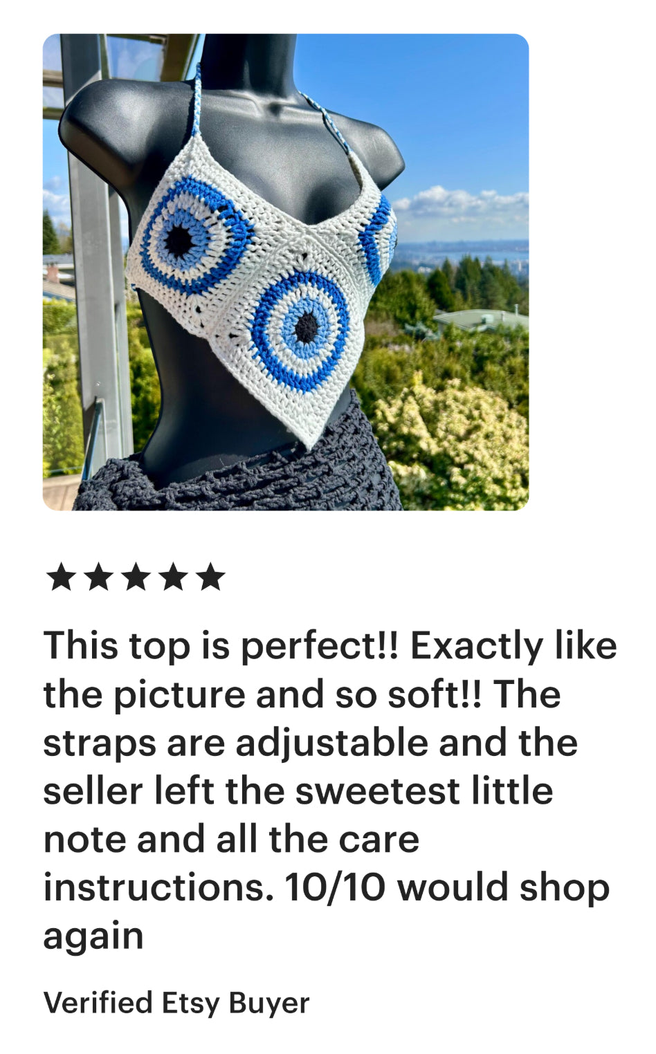 This handmade crochet crop top is a unique fusion of style and symbolism, featuring a striking evil eye granny square design. Crafted with care, each piece is meticulously crocheted using high-quality yarn, ensuring both comfort and durability. The bold evil eye motif adds a touch of mysticism, believed to offer protection and ward off negativity. Perfect for sunny days or layering over your favorite outfits, this crop top effortlessly combines boho-chic vibes with a modern twist. Whether you're dressing up for a festival or simply enjoying a laid-back day, this piece is sure to turn heads and keep you feeling empowered.